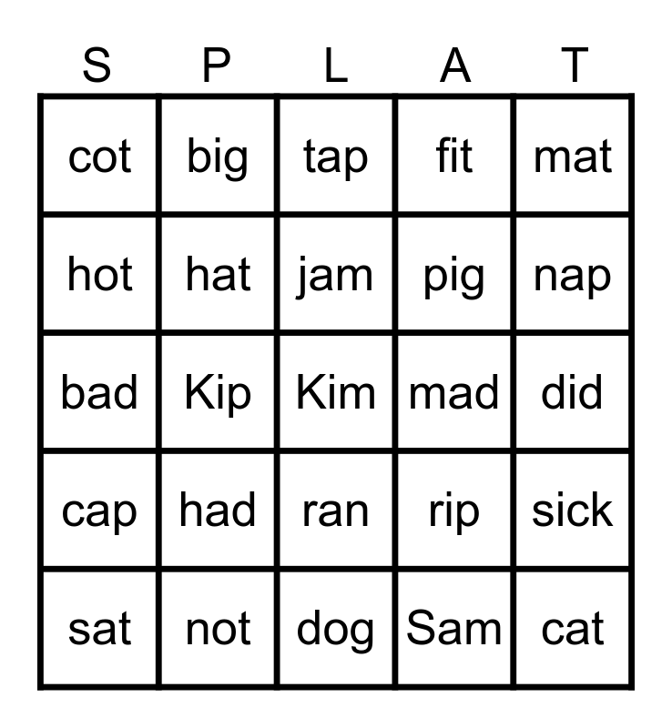 This bingo card has 32 words: Sam, Pam, Kip, Jim, cap, hat, mat, sick, big, cat, jam, tap, kid, pat, mad, sad, sat, bad, ran, had, rip, rat, did, not, Kim, fit, pig, hot, cot, dog, sit and nap.