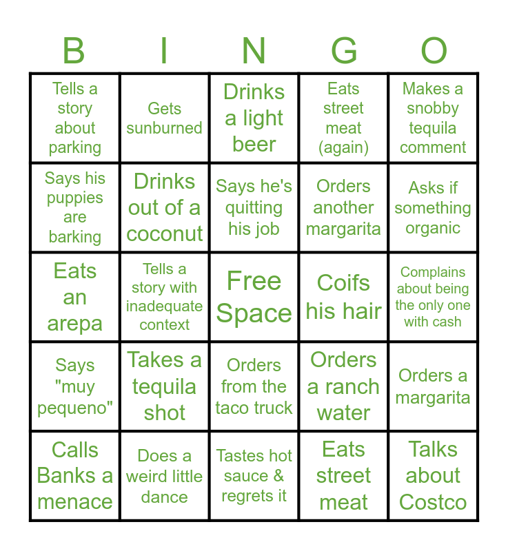 This bingo card has a free space and 32 words: Eats street meat, Does a Tony Soprano impression, Tells a story with inadequate context, Says "Vous", Says "muy pequeno", Drinks out of a coconut, Makes a snobby tequila comment, Orders a margarita, Gets sunburned, Tells a dad joke, Says he's quitting his job, Drinks a light beer, Unbuttons his shirt, Makes a pit stop at a port-a-potty, Coifs his hair, Gets free ice cream, Calls Banks a menace, Eats an arepa, Orders from the taco truck, Takes a tequila shot, Orders a ranch water, Talks about supplements, Complains about being the only one with cash, Does a weird little dance, Talks about Costco, Eats street meat (again), Orders another margarita, Says his puppies are barking, Tells a story about parking, Tastes hot sauce & regrets it, Blames something on Hochul, De Blasio, or Cuomo and Asks if something organic.