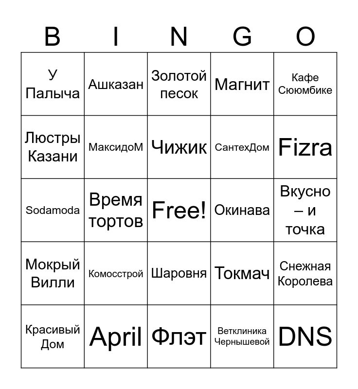 This bingo card has a free space and 89 words: Малинка, Пятёрочка, Шаровня, Королевский гранат, Профессорская клиника, Очарованный странник, Шоколадница, Грузинские истории, Сестрица, Мир Кубиков, Икорыч, Подружка, Снежная Королева, Вкусно – и точка, Зубная Лечебница, Чижик, Livedent, Гудвин, Мy мармелаD, Ёжик, Чак-чак, Store, Флэт, Фьюжн, Sodamoda, April, Akvareli, Мамин Сake, Смелые панды, Верный, Магнит, Время тортов, Чай с молоком, У Палыча, Мария, Золотой песок, Люстры Казани, Апрель, Fizra, Красивый Дом, Мокрый Вилли, Советская аптека, Ключ к здоровью, Масленица, Токмач, Окинава, KSTB, Каравай, Тубэтэй, Ашказан, Бургер Кинг, Samovar, Мануфактура, Sudarь, Усадьба, Цирюльня, Око, Спортмастер, Добропёк, Игромагия, Читай-город, БлинБери, Litso.cosm, МассажныхДелМастер, Скинмед, Рыболов, УютСтрой альянс, ПловБери, СберБанк, Комосстрой, DNS, Татсоцбанк, Теплостудия, СантехДом, МаксидоМ, Ветклиника Чернышевой, МТС, Пушкин, Онегин, Отель Максим Горький, Кафе Сююмбике, Хан Булак, Пойду поем, Скоро буду, Бери заряд!, Читай-город, Купи слона, Лепим и варим and Уберемся.ру..