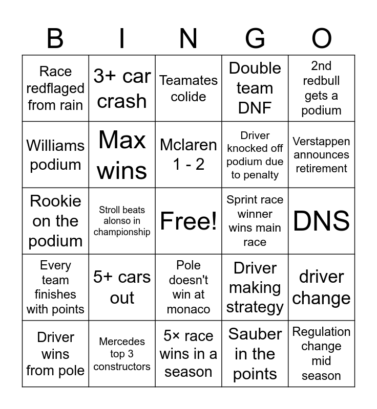 This bingo card has a free space and 24 words: Driver wins from pole, 5+ cars out, Mclaren 1 - 2, Sauber in the points, 2nd redbull gets a podium, Race redflaged from rain, 3+ car crash, Teamates colide, Sprint race winner wins main race, DNS, Rookie on the podium, Max wins, Driver making strategy, driver change, Williams podium, Mercedes top 3 constructors, 5× race wins in a season, Double team DNF, Verstappen announces retirement, Every team finishes with points, Stroll beats alonso in championship, Pole doesn't win at monaco, Driver knocked off podium due to penalty and Regulation change mid season.