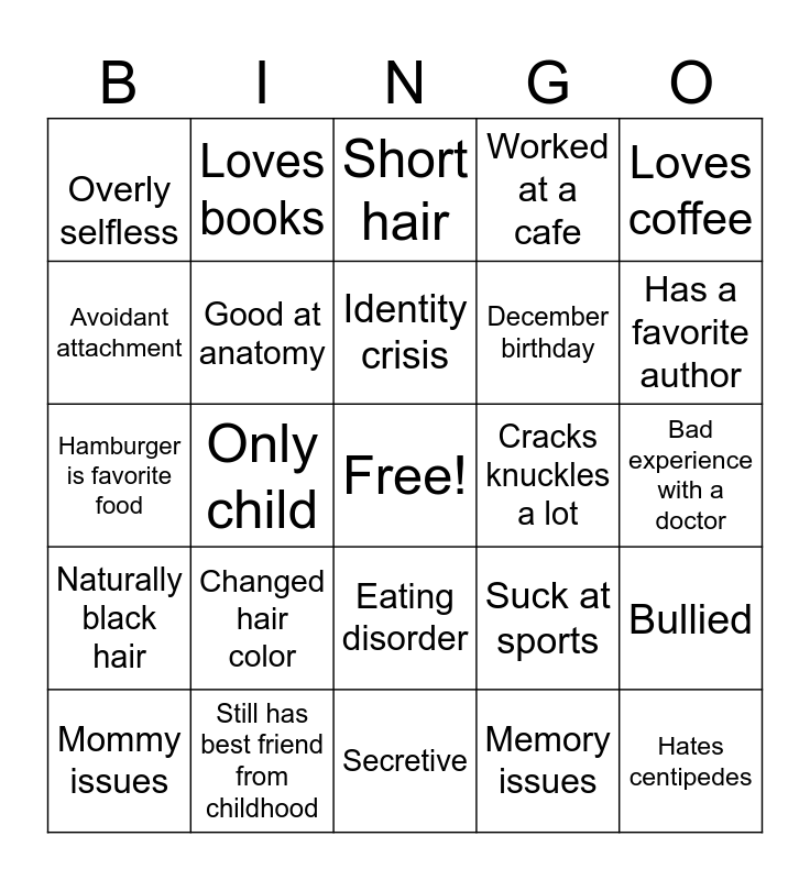 This bingo card has a free space and 24 words: Changed hair color, Still has best friend from childhood, Identity crisis, Mommy issues, Loves coffee, Overly selfless, Avoidant attachment, Loves books, Cracks knuckles a lot, Eating disorder, December birthday, Hamburger is favorite food, Suck at sports, Bullied, Good at anatomy, Memory issues, Bad experience with a doctor, Short hair, Has a favorite author, Only child, Hates centipedes, Naturally black hair, Worked at a cafe and Secretive.