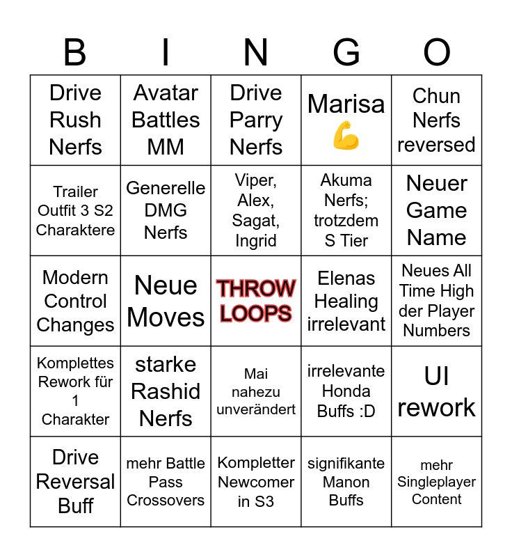 This bingo card has a free space and 24 words: starke Rashid Nerfs, mehr Battle Pass Crossovers, Viper, Alex, Sagat, Ingrid, Drive Reversal Buff, Chun Nerfs reversed, Drive Rush Nerfs, Trailer Outfit 3 S2 Charaktere, Avatar Battles MM, Elenas Healing irrelevant, Mai nahezu unverändert, Akuma Nerfs; trotzdem S Tier, Modern Control Changes, irrelevante Honda Buffs :D, UI rework, Generelle DMG Nerfs, signifikante Manon Buffs, Neues All Time High der Player Numbers, Drive Parry Nerfs, Neuer Game Name, Neue Moves, mehr Singleplayer Content, Komplettes Rework für 1 Charakter, Marisa 💪 and Kompletter Newcomer in S3.