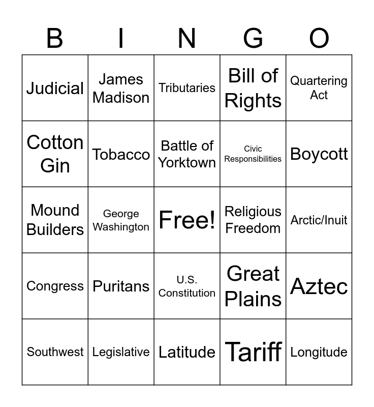 This bingo card has a free space and 54 words: President, Congress, Supreme Court, 1st Amendment, U.S. Constitution, Declaration of Independence, Bill of Rights, Fundamental Orders of Connecticut, Cotton Gin, Stamp Act, Judicial, Executive, Legislative, Southwest, Northeast, Latitude, Longitude, Civic Responsibilities, Civic Duties, Arctic/Inuit, Great Plains, Jamestown, Religious Freedom, Quartering Act, Thomas Jefferson, James Madison, France, Embargo, Tax, Tariff, Primary Election, Primary Source, Secondary Source, Pueblo, Tributaries, Mayan, Mound Builders, Aztec, Gold, God, Glory, Tobacco, Roanoke, New England, Middle, Southern, Puritans, The Proclamation of 1763, Battle of Lexington & Concord, Battle of Bunker Hill, Battle of Yorktown, George Washington, Boycott, Articles of Confederation, Preamble and Amendment.
