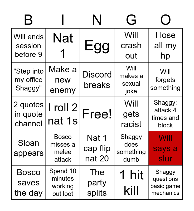 This bingo card has a free space and 24 words: Bosco misses a melee attack, Spend 10 minutes working out loot, Discord breaks, Bosco saves the day, I lose all my hp, Will ends session before 9, "Step into my office Shaggy", Nat 1, Will gets racist, Nat 1 cap flip nat 20, Will makes a sexual joke, 2 quotes in quote channel, Shaggy does something dumb, Will says a slur, Make a new enemy, 1 hit kill, Shaggy: attack 4 times and block, Egg, Will forgets something, I roll 2 nat 1s, Shaggy questions basic game mechanics, Sloan appears, Will crash out and The party splits.