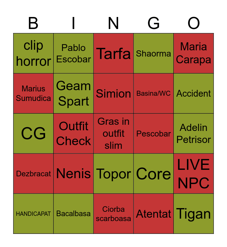 This bingo card has a free space and 24 words: Nenis, Bacalbasa, Simion, HANDICAPAT, Maria Carapa, clip horror, Marius Sumudica, Pablo Escobar, Pescobar, Topor, Basina/WC, CG, Core, LIVE NPC, Geam Spart, Atentat, Adelin Petrisor, Tarfa, Accident, Outfit Check, Tigan, Dezbracat, Shaorma and Ciorba scarboasa.
