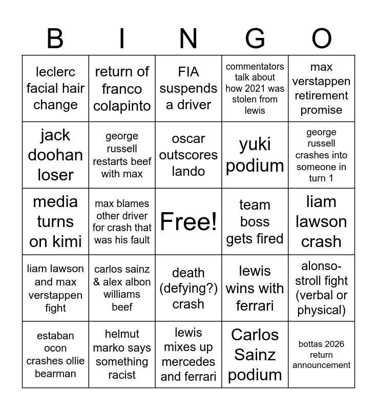 This bingo card has a free space and 25 words: carlos sainz & alex albon williams beef, lewis mixes up mercedes and ferrari, oscar outscores lando, estaban ocon crashes ollie bearman, max verstappen retirement promise, leclerc facial hair change, jack doohan loser, return of franco colapinto, team boss gets fired, death (defying?) crash, yuki podium, media turns on kimi, lewis wins with ferrari, alonso-stroll fight (verbal or physical), george russell restarts beef with max, stake points, liam lawson crash, FIA suspends a driver, george russell crashes into someone in turn 1, max blames other driver for crash that was his fault, bottas 2026 return announcement, helmut marko says something racist, liam lawson and max verstappen fight, commentators talk about how 2021 was stolen from lewis and Carlos Sainz podium.
