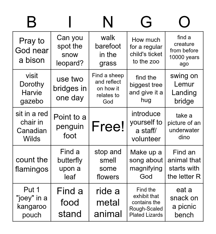 This bingo card has a free space and 29 words: Put 1 "joey" in a kangaroo pouch, Find 5 things that remind you of God, Point to a penguin foot, Climb a rock, Pray to God near a bison, walk barefoot in the grass, use two bridges in one day, Find a butterfly upon a leaf, introduce yourself to a staff/ volunteer, Find a food stand, take a picture of an underwater dino, eat a snack on a picnic bench, ride a metal animal, Find the exhibit that contains the Rough-Scaled Plated Lizards, swing on Lemur Landing bridge, Pick out your favorite carousel animal, stop and smell some flowers, count the flamingos, find a creature from before 10000 years ago, sit in a red chair in Canadian Wilds, Make up a song about magnifying God, take a selfie of an animal who looks like you, find the biggest tree and give it a hug, visit Dorothy Harvie gazebo, How much for a regular child's ticket to the zoo, Can you spot the snow leopard?, Find an animal that starts with the letter R, Find a sheep and reflect on how it relates to God and Find a stationary, fixed object that is blue.