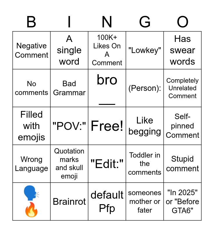 This bingo card has a free space and 24 words: Quotation marks and skull emoji, Brainrot, bro __, 🗣️🔥, Has swear words, Negative Comment, No comments, A single word, Like begging, "Edit:", (Person):, Filled with emojis, Toddler in the comments, Stupid comment, Bad Grammar, someones mother or fater, Self-pinned Comment, 100K+ Likes On A Comment, Completely Unrelated Comment, "POV:", "In 2025" or "Before GTA6", Wrong Language, "Lowkey" and default Pfp.