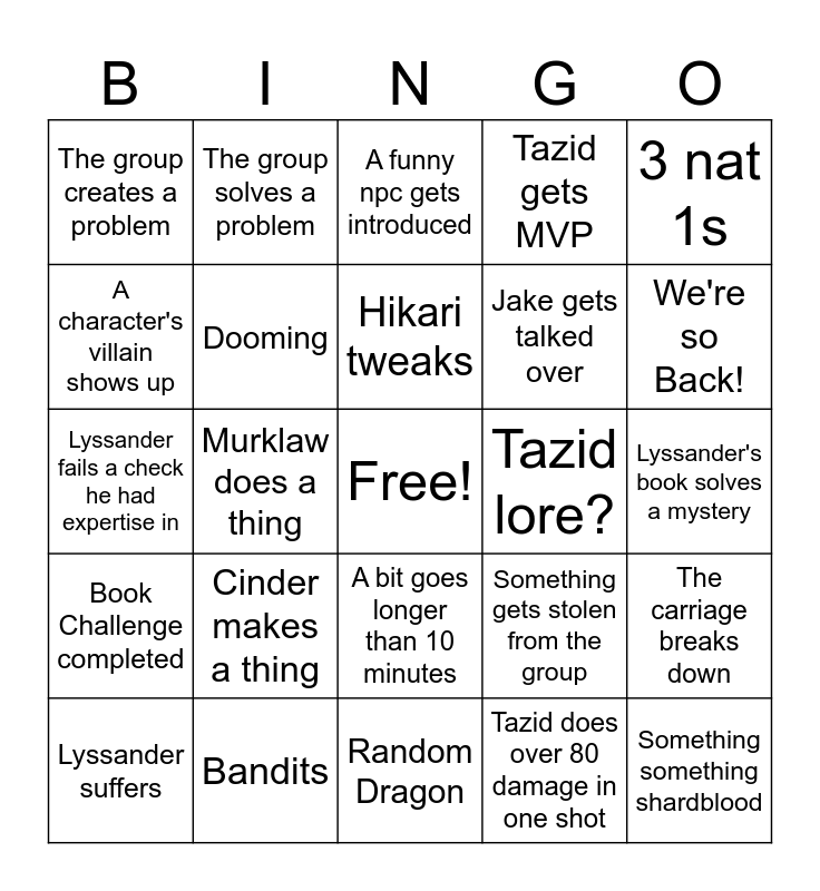 This bingo card has a free space and 24 words: Lyssander suffers, Cinder makes a thing, Hikari tweaks, Tazid does over 80 damage in one shot, 3 nat 1s, The group creates a problem, The group solves a problem, A funny npc gets introduced, Tazid lore?, Lyssander's book solves a mystery, Lyssander fails a check he had expertise in, Dooming, Something gets stolen from the group, The carriage breaks down, A character's villain shows up, Bandits, Random Dragon, Tazid gets MVP, We're so Back!, Book Challenge completed, Murklaw does a thing, A bit goes longer than 10 minutes, Jake gets talked over and Something something shardblood.