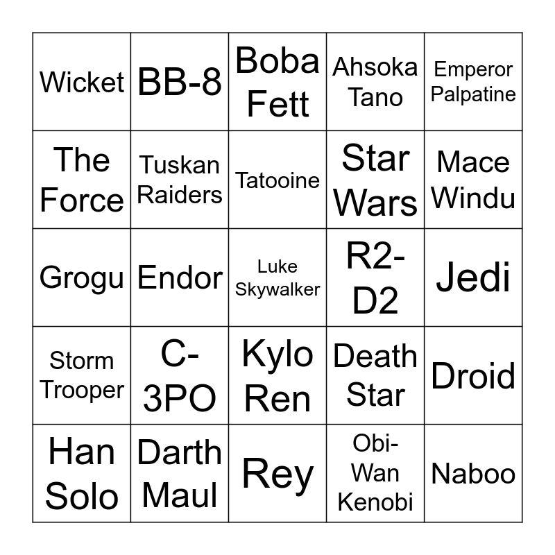 This bingo card has 45 words: Anakin Skywalker, Luke Skywalker, Princess Leia, Han Solo, Yoda, Obi-Wan Kenobi, Boba Fett, Chewbacca, Emperor Palpatine, Darth Maul, Ahsoka Tano, R2-D2, Kylo Ren, C-3PO, General Grievous, Rey, Queen Amidala, Grogu, Jabba the Hutt, Mace Windu, BB-8, Greedo, Lando Calrissian, Wicket, Jar-Jar Binks, Jedi, Rebel, Millennium Falcon, Death Star, Storm Trooper, Light Saber, Droid, AT-AT Walker, X-Wing, Ewok, Endor, Coruscant, Cloud City, Naboo, Tatooine, The Force, Star Wars, Tie Fighter, Tuskan Raiders and Jawa.