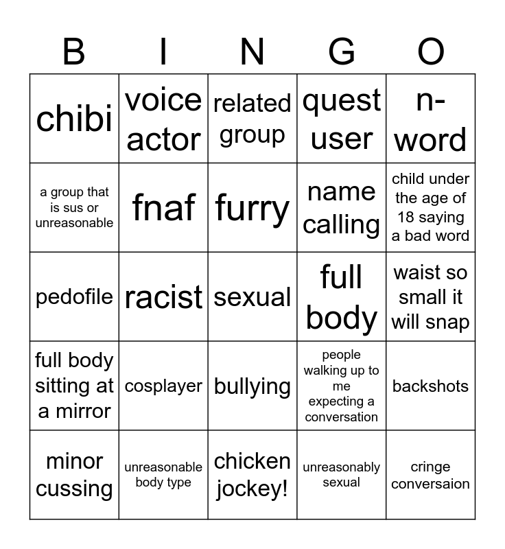This bingo card has a free space and 24 words: cosplayer, unreasonable body type, furry, minor cussing, n-word, chibi, a group that is sus or unreasonable, voice actor, full body, bullying, name calling, pedofile, people walking up to me expecting a conversation, backshots, fnaf, unreasonably sexual, waist so small it will snap, related group, child under the age of 18 saying a bad word, racist, cringe conversaion, full body sitting at a mirror, quest user and chicken jockey!.