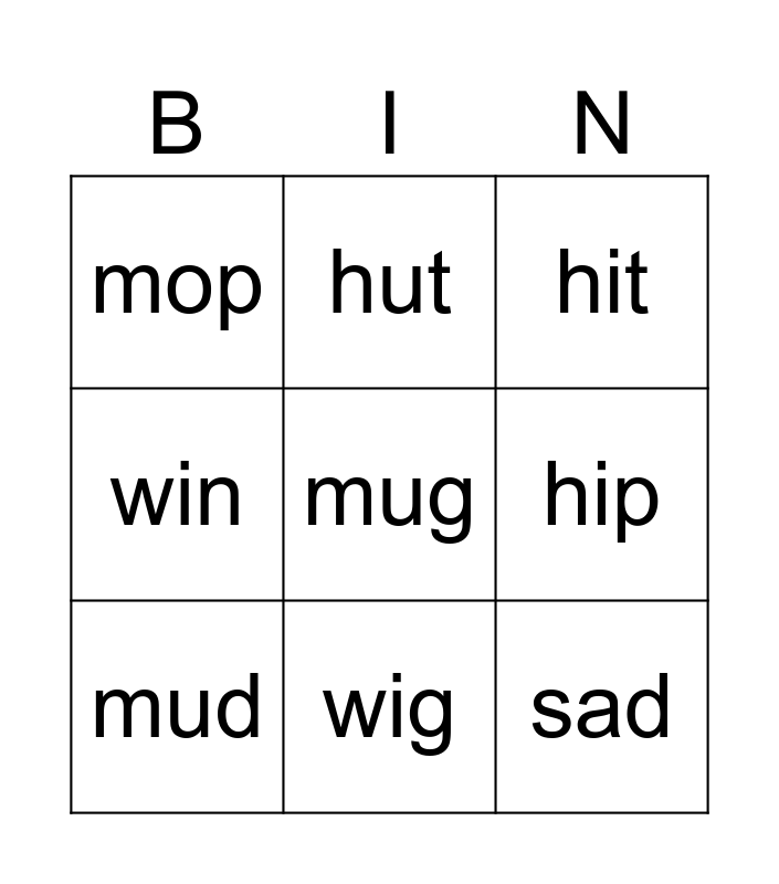 This bingo card has a free space and 8 words: hip, hit, hut, mud, mop, sad, win and wig.