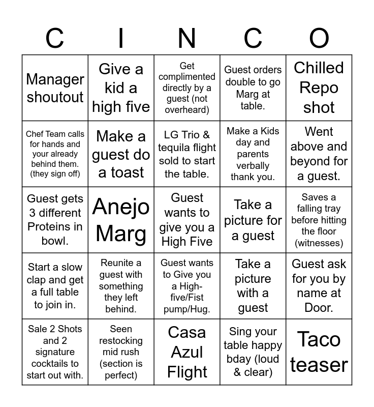 This bingo card has 31 words: Casa Azul Flight, Mezcal flight, Anejo Marg, Chef Shoutout, Manager shoutout, Get complimented directly by a guest (not overheard), Make a guest do a toast, Take a picture with a guest, Take a picture for a guest, Sing your table happy bday (loud & clear), Saves a falling tray before hitting the floor (witnesses), Guest wants to give you a High Five, Taco teaser, Refilled Glasses , Clean section and Tables bussed., Went above and beyond for a guest., BOH team member shout you out., Guest ask for you by name at Door., Reunite a guest with something they left behind., Start a slow clap and get a full table to join in., Guest wants to Give you a High-five/Fist pump/Hug., Chilled Repo shot, Sale four different drinks to a 4 Top (all alcohol), Sale 2 Shots and 2 signature cocktails to start out with., Give a kid a high five, Make a Kids day and parents verbally thank you., Chef Team calls for hands and your already behind them. (they sign off), Guest orders double to go Marg at table., Guest gets 3 different Proteins in bowl., Seen restocking mid rush (section is perfect), LG Trio & tequila flight sold to start the table. and Get a meaningful 5 star shoutout (name drop and detailed experience).