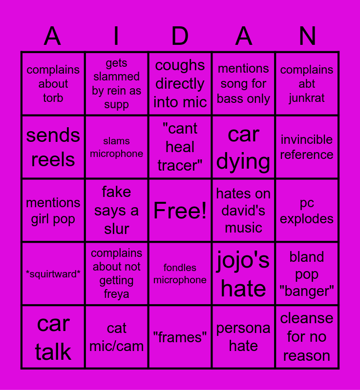 This bingo card has a free space and 24 words: complains about not getting freya, cat mic/cam, "cant heal tracer", car talk, complains abt junkrat, complains about torb, sends reels, gets slammed by rein as supp, hates on david's music, fondles microphone, car dying, mentions girl pop, jojo's hate, bland pop "banger", slams microphone, persona hate, pc explodes, coughs directly into mic, invincible reference, fake says a slur, cleanse for no reason, *squirtward*, mentions song for bass only and "frames".