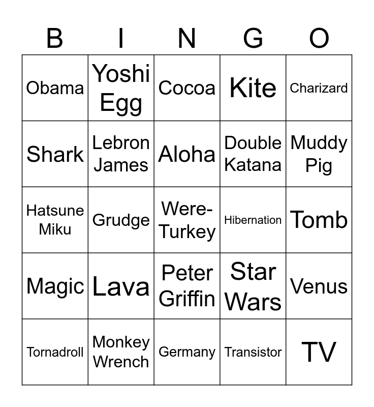 This bingo card has a free space and 24 words: Lava, Monkey Wrench, Aloha, Tornadroll, Charizard, Obama, Shark, Yoshi Egg, Hibernation, Peter Griffin, Double Katana, Hatsune Miku, Star Wars, Venus, Lebron James, Transistor, Tomb, Cocoa, Muddy Pig, Grudge, TV, Magic, Kite and Germany.