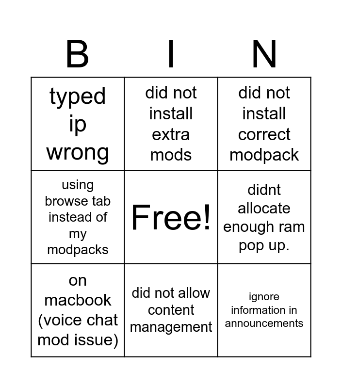 This bingo card has a free space and 8 words: didnt allocate enough ram pop up., did not install correct modpack, did not install extra mods, on macbook (voice chat mod issue), typed ip wrong, ignore information in announcements, using browse tab instead of my modpacks and did not allow content management.