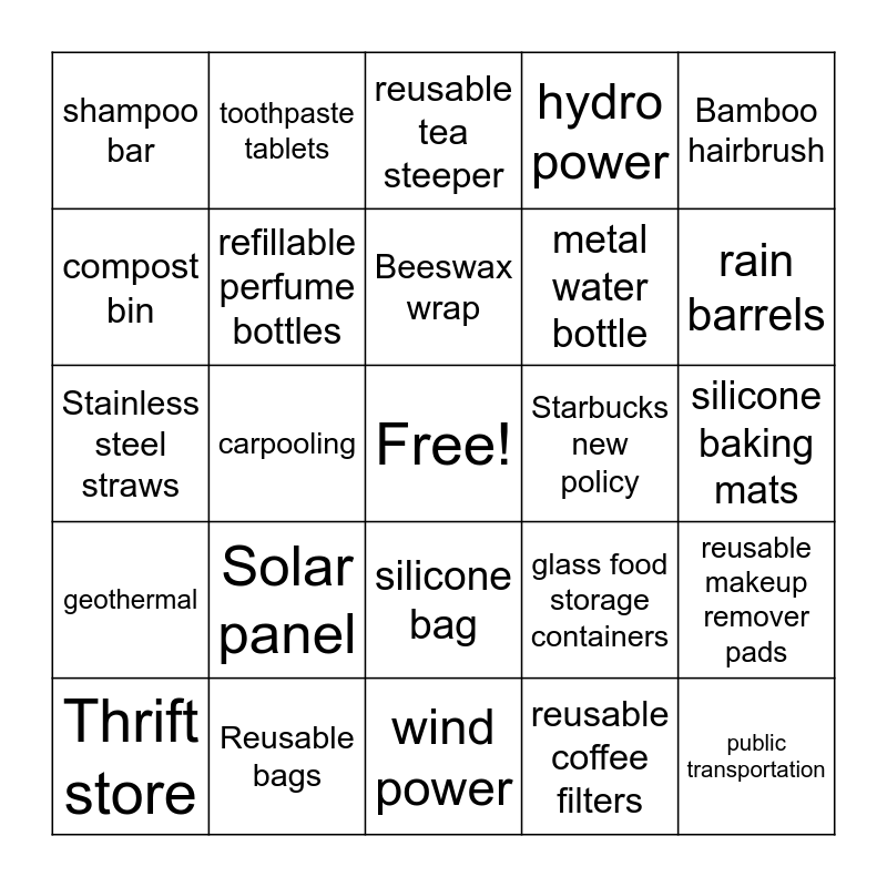 This bingo card has a free space and 24 words: Solar panel, Reusable bags, Beeswax wrap, Thrift store, Bamboo hairbrush, shampoo bar, compost bin, toothpaste tablets, Starbucks new policy, silicone bag, metal water bottle, Stainless steel straws, glass food storage containers, reusable makeup remover pads, refillable perfume bottles, reusable coffee filters, silicone baking mats, reusable tea steeper, rain barrels, carpooling, public transportation, geothermal, hydro power and wind power.