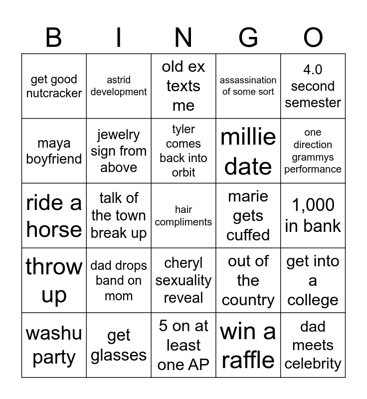 This bingo card has a free space and 24 words: dad drops band on mom, get glasses, tyler comes back into orbit, washu party, 4.0 second semester, get good nutcracker, maya boyfriend, astrid development, marie gets cuffed, cheryl sexuality reveal, millie date, ride a horse, out of the country, get into a college, jewelry sign from above, win a raffle, 1,000 in bank, old ex texts me, one direction grammys performance, talk of the town break up, dad meets celebrity, throw up, assassination of some sort and 5 on at least one AP.