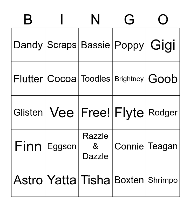 This bingo card has a free space and 29 words: Astro, Shelly, Vee, Sprout, Dandy, Bassie, Cocoa, Eggson, Flyte, Yatta, Rodger, Shrimpo, Tisha, Boxten, Goob, Looey, Razzle & Dazzle, Finn, Gigi, Glisten, Connie, Cosmo, Brightney, Flutter, Poppy, Scraps, Teagan, Toodles and Pebble.