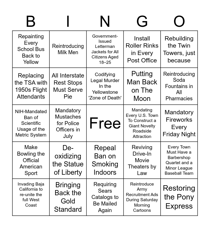 This bingo card has a free space and 24 words: De-oxidizing the Statue of Liberty, Bringing Back the Gold Standard, Codifying Legal Murder In the Yellowstone 'Zone of Death', Invading Baja California to re-unite the full West Coast, Rebuilding the Twin Towers, just because, Repainting Every School Bus Back to Yellow, Replacing the TSA with 1950s Flight Attendants, Reintroducing Milk Men, Mandating Every U.S. Town To Construct a Giant Novelty Roadside Attraction, Repeal Ban on Smoking Indoors, Putting Man Back on The Moon, NIH-Mandated Ban of Scientific Usage of the Metric System, Reviving Drive-In Movie Theaters by Law, Every Town Must Have a Barbershop Quartet and a Minor League Baseball Team, All Interstate Rest Stops Must Serve Pie, Reintroduce Army Recruitment Ads During Saturday Morning Cartoons, Mandatory Fireworks Every Friday Night, Government-Issued Letterman Jackets for All Citizens Aged 18–25, Reintroducing Soda Fountains in All Pharmacies, Mandatory Mustaches for Police Officers in July, Restoring the Pony Express, Make Bowling the Official American Sport, Install Roller Rinks in Every Post Office and Requiring Sears Catalogs to Be Mailed Again.
