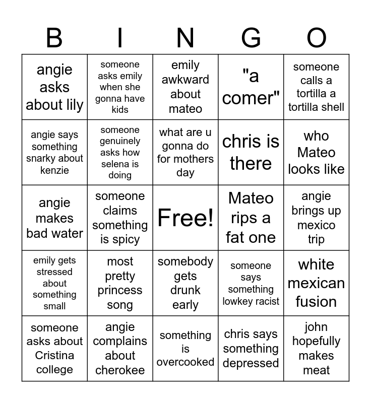 This bingo card has a free space and 28 words: white mexican fusion, josh chris argument, chris is there, chris says something depressed, angie says something snarky about kenzie, emily awkward about mateo, someone asks emily when she gonna have kids, emily gets stressed about something small, Mateo rips a fat one, someone asks about Cristina college, angie makes bad water, "a comer", angie complains about cherokee, something is overcooked, who Mateo looks like, angie thought Mateo was white, most pretty princess song, someone genuinely asks how selena is doing, what are u gonna do for mothers day, somebody gets drunk early, angie asks about lily, trump talk, john hopefully makes meat, someone claims something is spicy, angie brings up mexico trip, someone says something lowkey racist, someone calls a tortilla a tortilla shell and "Cristina what did u bring??".