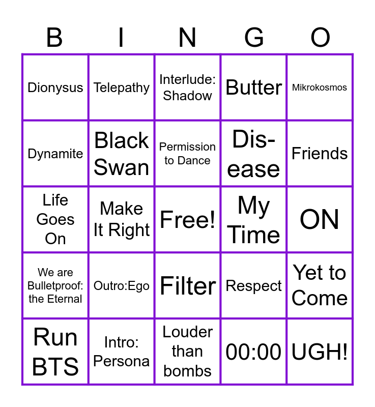 This bingo card has a free space and 30 words: Intro: Persona, Boy With Luv, Make It Right, Jamais Vu, Dionysus, Interlude: Shadow, Black Swan, Filter, My Time, Louder than bombs, ON, UGH!, 00:00, Inner Child, Friends, Moon, Respect, We are Bulletproof: the Eternal, Outro:Ego, Mikrokosmos, Life Goes On, Blue & Grey, Telepathy, Dis-ease, Dynamite, Butter, Yet to Come, Run BTS, Permission to Dance and Take Two.