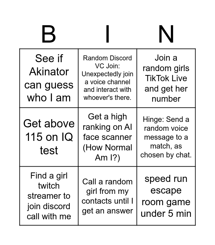 This bingo card has a free space and 8 words: Hinge: Send a random voice message to a match, as chosen by chat., Join a random girls TikTok Live and get her number, Random Discord VC Join: Unexpectedly join a voice channel and interact with whoever's there., Find a girl twitch streamer to join discord call with me, See if Akinator can guess who I am, speed run escape room game under 5 min, Get above 115 on IQ test and Call a random girl from my contacts until I get an answer.
