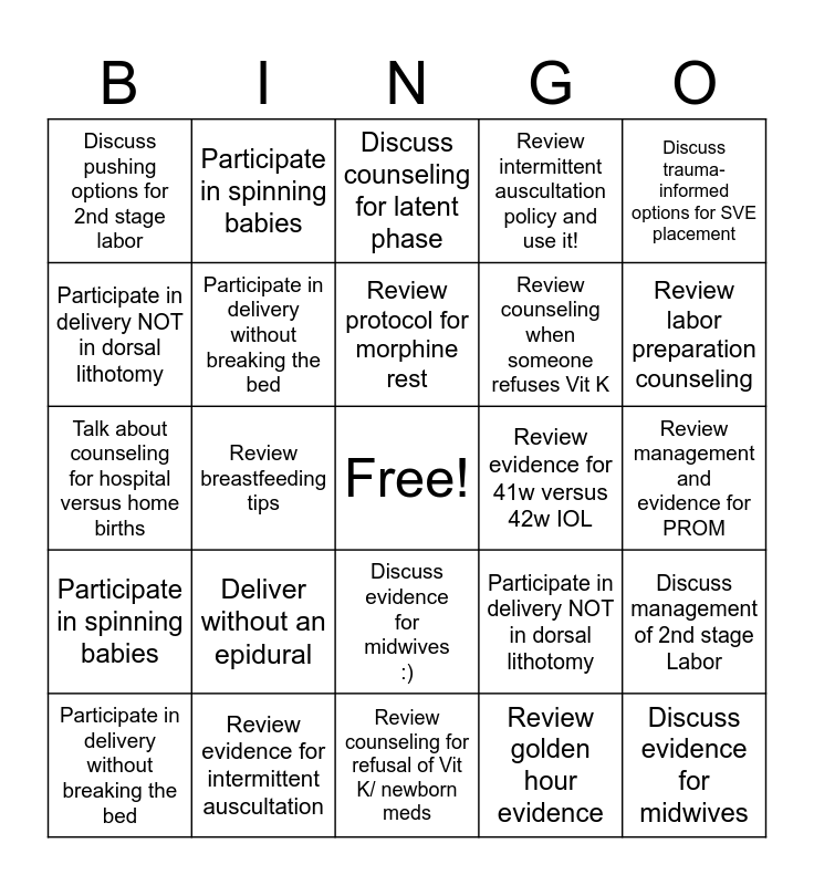 This bingo card has a free space and 24 words: Deliver without an epidural, Review evidence for intermittent auscultation, Review protocol for morphine rest, Participate in delivery without breaking the bed, Discuss trauma-informed options for SVE placement, Discuss pushing options for 2nd stage labor, Participate in delivery NOT in dorsal lithotomy, Participate in spinning babies, Review evidence for 41w versus 42w IOL, Discuss evidence for midwives :), Review counseling when someone refuses Vit K, Talk about counseling for hospital versus home births, Participate in delivery NOT in dorsal lithotomy, Discuss management of 2nd stage Labor, Participate in delivery without breaking the bed, Review golden hour evidence, Review management and evidence for PROM, Discuss counseling for latent phase, Review labor preparation counseling, Review breastfeeding tips, Discuss evidence for midwives, Participate in spinning babies, Review intermittent auscultation policy and use it! and Review counseling for refusal of Vit K/ newborn meds.