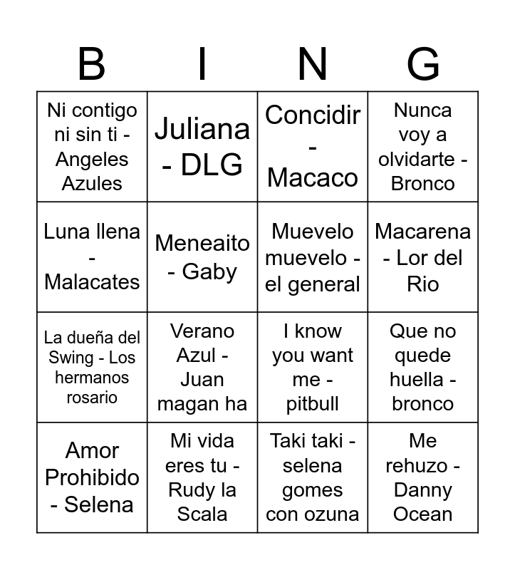 This bingo card has 44 words: Free!, Amor Prohibido - Selena, Nunca es suficiente - Angeles azules, Mayonesa - Chocolate, YMCA - village people, El venado - Los cantantes, Concidir - Macaco, Moviendo la cadera - Hermanos rosario, Luna llena - Malacates, Despacito - Luis fonsi, Nunca voy a olvidarte - Bronco, Mi vida eres tu - Rudy la Scala, Asi fue - Juan Gabiel, En Privado - Xavi y Manuel Turizo, Ojo Marrones - Lasso, El tiburon - Proyecto Uno, Reflcting Ligtht - Sam Phillips, I know you want me - pitbull, Re regalo - Carla Morrison, Verano Azul - Juan magan ha, Juliana - DLG, La ciguapa - Chichi peralta, Como te voy a olvidar - Angeles azules, Ni contigo ni sin ti - Angeles Azules, Tu eres ajena - Eddy Herrera, Taki taki - selena gomes con ozuna, Mañan sera bonito - karol g, Volvere - Rudy Perez, Tacones rojos - sebastian yatra, Me rehuzo - Danny Ocean, Que agonia - yuridia, Quiero ser tu amigo nada mas - angeles azules, tattoo - rauw alejandro y camilo, Adoro - bronco, Que no quede huella - bronco, Se menea - los karkik's, La brujita - los tupamaros, Kulikitaka - Toño Rosario, Macarena - Lor del Rio, Meneaito - Gaby, La dueña del Swing - Los hermanos rosario, El baile del perrito - Wilfrido Vargas, Muevelo muevelo - el general and Cancion Bonita - Carlos Vives.