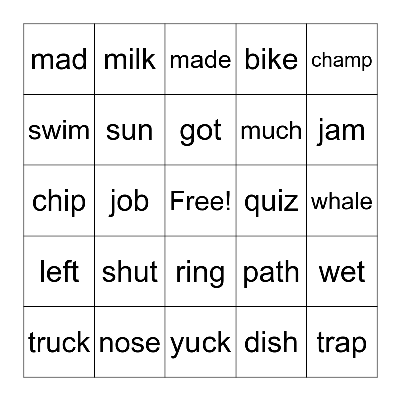 This bingo card has a free space and 24 words: shut, nose, got, truck, champ, mad, swim, milk, quiz, ring, much, chip, path, wet, sun, dish, whale, made, jam, job, trap, left, bike and yuck.
