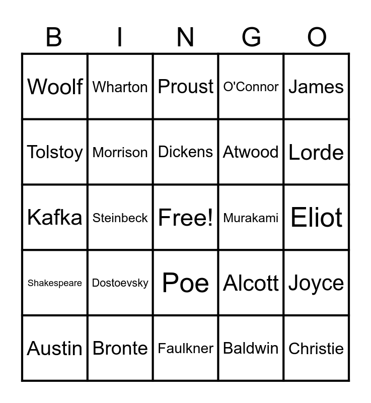 This bingo card has a free space and 24 words: Dostoevsky, Bronte, Dickens, Austin, James, Woolf, Tolstoy, Wharton, Murakami, Poe, Atwood, Kafka, Alcott, Joyce, Morrison, Baldwin, Eliot, Proust, Lorde, Steinbeck, Christie, Shakespeare, O'Connor and Faulkner.