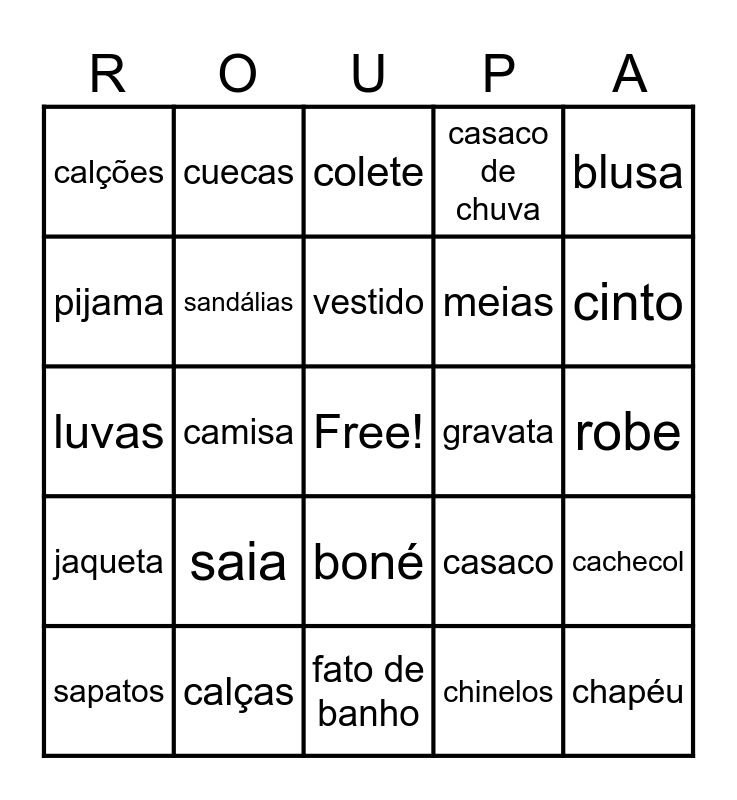 This bingo card has a free space and 24 words: saia, calças, vestido, sapatos, blusa, calções, pijama, cuecas, gravata, boné, meias, luvas, casaco, cachecol, sandálias, chinelos, robe, colete, cinto, camisa, chapéu, jaqueta, casaco de chuva and fato de banho.