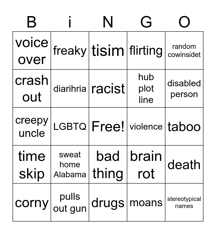 This bingo card has a free space and 24 words: sweat home Alabama, pulls out gun, racist, corny, random cowinsidet, voice over, crash out, freaky, violence, bad thing, hub plot line, creepy uncle, brain rot, death, diarihria, moans, taboo, tisim, disabled person, LGBTQ, stereotypical names, time skip, flirting and drugs.