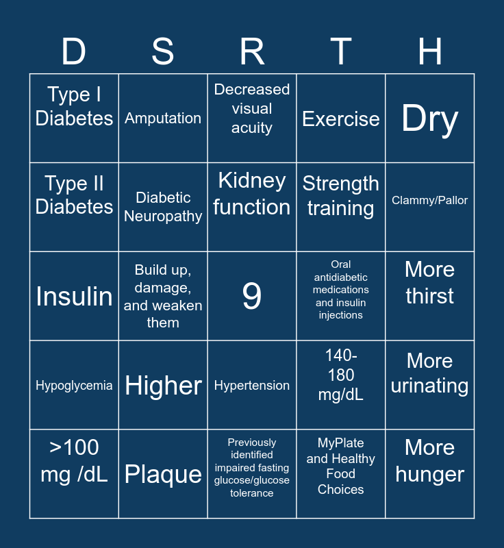 This bingo card has 40 words: Diabetes Mellitus, Build up, damage, and weaken them, >30, 140-180 mg/dL, More hunger, Insulin, Diabetic Neuropathy, ≤35, Strength training, More urinating, Type I Diabetes, Amputation, 9, MyPlate and Healthy Food Choices, More thirst, Type II Diabetes, Diabetics have delayed wound healing, Decreased visual acuity, To detect patterns and reduce long-term diabetic complications, Dry, Hypoglycemia, Plaque, Kidney function, Oral antidiabetic medications and insulin injections, Blurred, <70 mg/dL, Heart Attack, Gestational diabetes, To control blood sugar levels and maintain a healthy BMI, TIRED, Hyperglycemia, Higher, Hypertension, Before and 2 hours after big meals, Clammy/Pallor, >100 mg /dL, Numbness, Previously identified impaired fasting glucose/glucose tolerance, Exercise and Tachycardic.