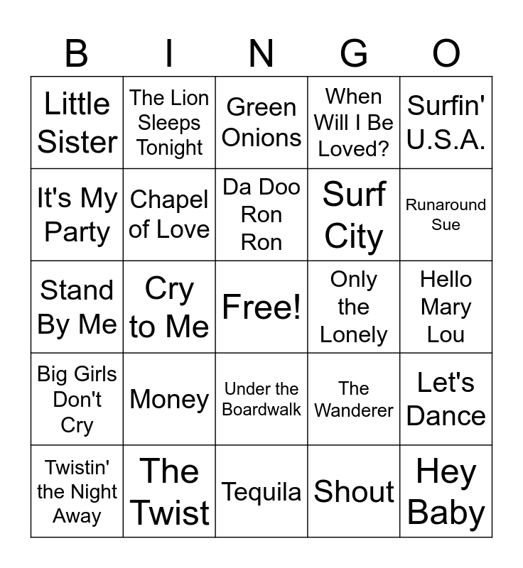 This bingo card has a free space and 43 words: Runaway, Hey Baby, Tossin' and Turnin', Twistin' the Night Away, Hit the Road Jack, Shout, Green Onions, Louie, Louie, Surfin' U.S.A., The Twist, When Will I Be Loved?, Only the Lonely, Under the Boardwalk, Money, Tell Him, Tequila, Running Bear, Stand By Me, Crazy, Runaround Sue, The Lion Sleeps Tonight, Barbara Ann, Blue Moon, Little Sister, Will You Love Me Tomorrow, Hello Mary Lou, The Locomotion, Breaking Up Is Hard To Do, The Wanderer, Big Girls Don't Cry, Do You Love Me, Let's Dance, Limbo Rock, Cry to Me, My Boyfriend's Back, Be My Baby, Heatwave, Da Doo Ron Ron, It's My Party, Surf City, Please Please Me, Chapel of Love and The Shoop Shoop Song.