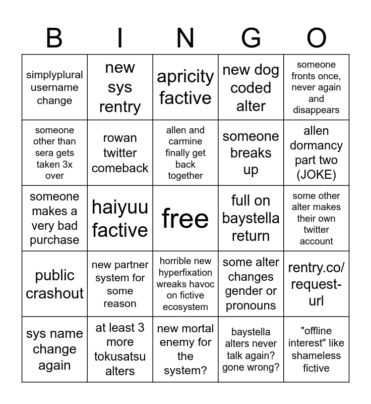 This bingo card has a free space and 24 words: new partner system for some reason, at least 3 more tokusatsu alters, allen and carmine finally get back together, sys name change again, someone fronts once, never again and disappears, simplyplural username change, someone other than sera gets taken 3x over, new sys rentry, full on baystella return, horrible new hyperfixation wreaks havoc on fictive ecosystem, someone breaks up, someone makes a very bad purchase, some alter changes gender or pronouns, rentry.co/ request-url, rowan twitter comeback, baystella alters never talk again? gone wrong?, some other alter makes their own twitter account, apricity factive, allen dormancy part two (JOKE), haiyuu factive, "offline interest" like shameless fictive, public crashout, new dog coded alter and new mortal enemy for the system?.