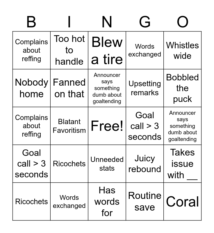 This bingo card has a free space and 51 words: Off the iron, Coral, Bobbled the puck, Has words for, Ricochets, Blew a tire, Too hot to handle, Puck squirts free, Nobody home, Swing and a miss, Fanned on that, Words exchanged, Takes issue with __, Juicy rebound, Grand larceny / robbery, Hot mic, Announcer says something dumb about goaltending, Goal call > 3 seconds, Broken up, Whistles wide, Blatant Favoritism, Routine save, Complains about reffing, Upsetting remarks, Off the iron, Coral, Bobbled the puck, Has words for, Ricochets, Blew a tire, Too hot to handle, Puck squirts free, Nobody home, Swing and a miss, Fanned on that, Words exchanged, Takes issue with __, Juicy rebound, Grand larceny / robbery, Hot mic, Announcer says something dumb about goaltending, Goal call > 3 seconds, Broken up, Whistles wide, Blatant Favoritism, Routine save, Complains about reffing, Upsetting remarks, Mentions players height/weight, Unneeded stats and Parents of player shown.