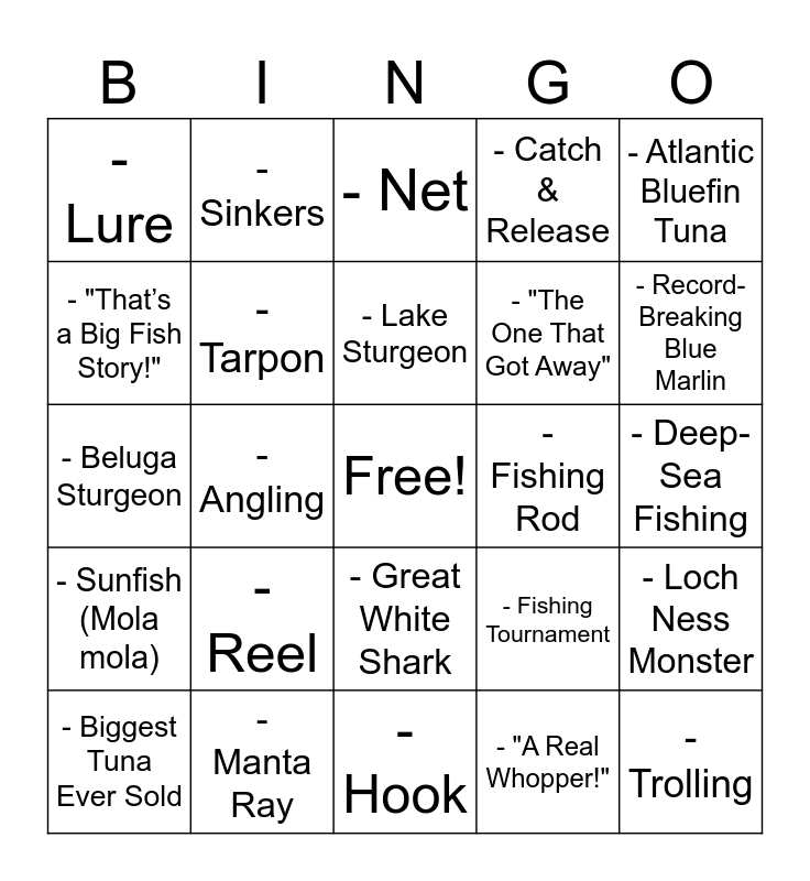 This bingo card has a free space and 40 words: - Whale Shark, - Beluga Sturgeon, - Blue Marlin, - Tarpon, - Manta Ray, - Great White Shark, - Lake Sturgeon, - Snailfish, - Atlantic Bluefin Tuna, - Sunfish (Mola mola), - Angling, - Catch & Release, - Trolling, - Deep-Sea Fishing, - Fishing Rod, - Reel, - Bait, - Lure, - Tackle Box, - Net, - Loch Ness Monster, - "A Real Whopper!", - "The One That Got Away", - "That’s a Big Fish Story!", - Legendary Deep Lake Fish, - Pacific Ocean, - Coral Reef, - Mariana Trench, - Amazon River, - Great Lakes, - World Record Catch, - Biggest Tuna Ever Sold, - Trophy Fish, - Fishing Tournament, - Record-Breaking Blue Marlin, - Hook, - Line, - Float, - Sinkers and - Waders.