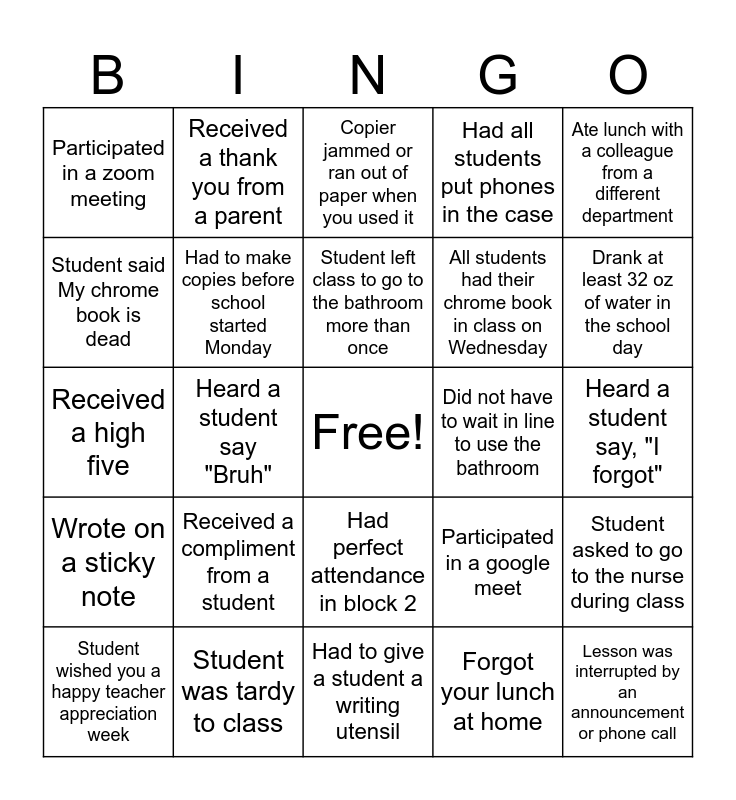 This bingo card has a free space and 24 words: Received a compliment from a student, Student was tardy to class, Student left class to go to the bathroom more than once, Student wished you a happy teacher appreciation week, Ate lunch with a colleague from a different department, Participated in a zoom meeting, Student said My chrome book is dead, Received a thank you from a parent, Did not have to wait in line to use the bathroom, Had perfect attendance in block 2, All students had their chrome book in class on Wednesday, Received a high five, Participated in a google meet, Student asked to go to the nurse during class, Had to make copies before school started Monday, Forgot your lunch at home, Heard a student say, "I forgot", Copier jammed or ran out of paper when you used it, Drank at least 32 oz of water in the school day, Heard a student say "Bruh", Lesson was interrupted by an announcement or phone call, Wrote on a sticky note, Had all students put phones in the case and Had to give a student a writing utensil.