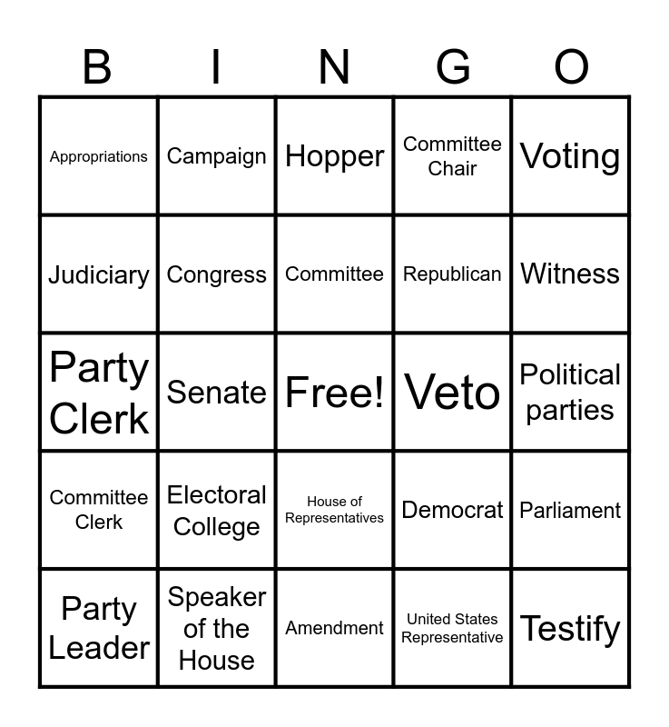 This bingo card has a free space and 26 words: House of Representatives, United States Representative, Committee, Speaker of the House, Voting, Appropriations, Judiciary, Campaign, Political parties, Democrat, Republican, Party Clerk, Parliament, Party Leader, Senate, House Clerk, Committee Chair, Committee Clerk, Hopper, Testify, Witness, Amendment, Veto, Electoral College, Congress and Bill.