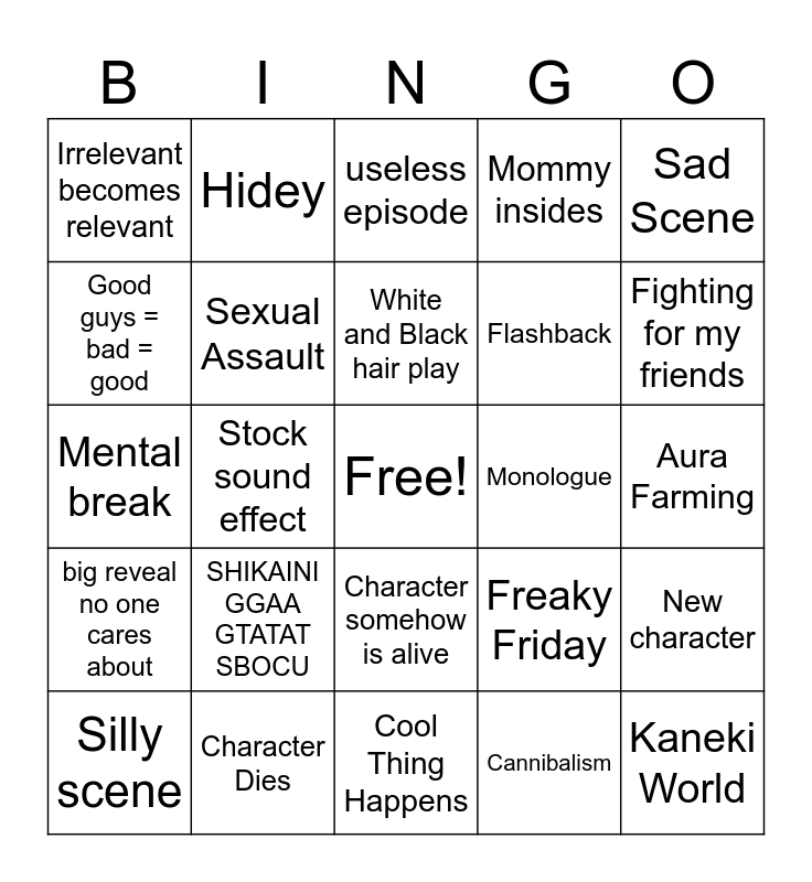 This bingo card has a free space and 24 words: SHIKAINI GGAA GTATAT SBOCU, Character Dies, White and Black hair play, Silly scene, Sad Scene, Irrelevant becomes relevant, Good guys = bad = good, Hidey, Monologue, Character somehow is alive, Flashback, Mental break, Freaky Friday, New character, Sexual Assault, Cannibalism, Aura Farming, useless episode, Fighting for my friends, Stock sound effect, Kaneki World, big reveal no one cares about, Mommy insides and Cool Thing Happens.