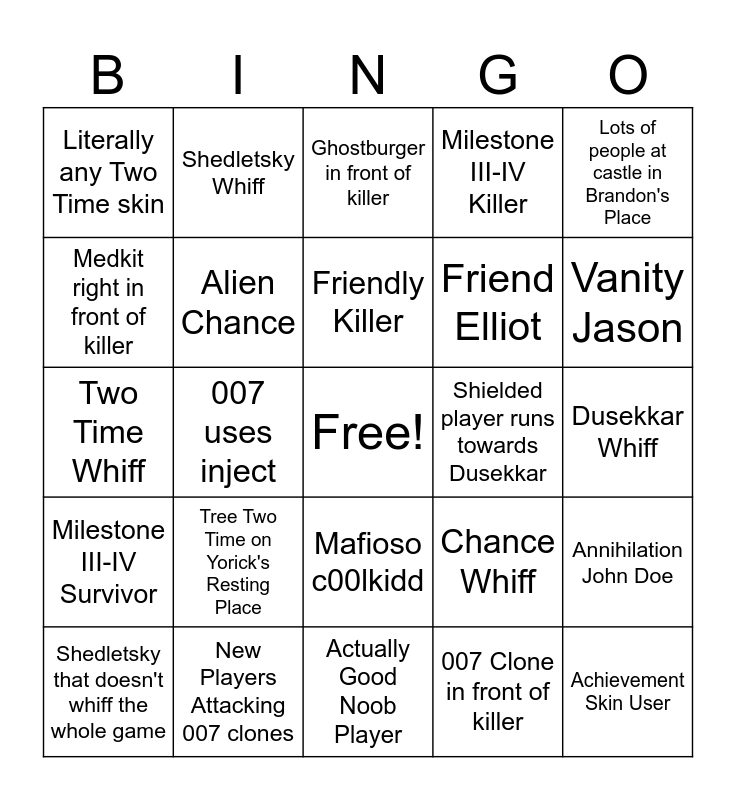 This bingo card has a free space and 24 words: Tree Two Time on Yorick's Resting Place, New Players Attacking 007 clones, Friendly Killer, Shedletsky that doesn't whiff the whole game, Lots of people at castle in Brandon's Place, Literally any Two Time skin, Medkit right in front of killer, Shedletsky Whiff, Shielded player runs towards Dusekkar, Mafioso c00lkidd, Friend Elliot, Two Time Whiff, Chance Whiff, Annihilation John Doe, Alien Chance, 007 Clone in front of killer, Dusekkar Whiff, Ghostburger in front of killer, Vanity Jason, 007 uses inject, Achievement Skin User, Milestone III-IV Survivor, Milestone III-IV Killer and Actually Good Noob Player.