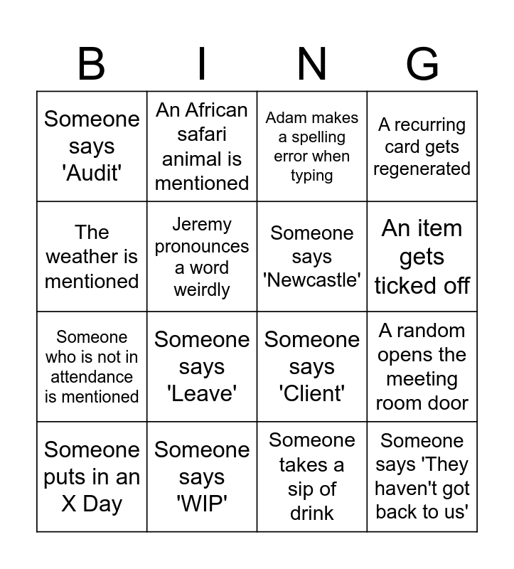 This bingo card has 16 words: Someone says 'WIP', A random opens the meeting room door, Adam makes a spelling error when typing, Someone says 'Audit', Someone who is not in attendance is mentioned, An African safari animal is mentioned, Someone says 'Client', Someone takes a sip of drink, The weather is mentioned, Jeremy pronounces a word weirdly, Someone puts in an X Day, A recurring card gets regenerated, Someone says 'Leave', An item gets ticked off, Someone says 'Newcastle' and Someone says 'They haven't got back to us'.