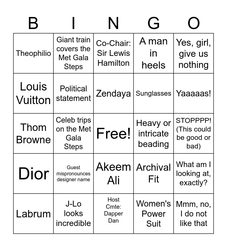 This bingo card has a free space and 161 words: Versace, A-lister shows up hella late, Co-Chair: Anna Wintour, Reference to Prince, Slay, Gucci, New Met Gala winner, Co-Chair: Coleman Domingo, Zoot Suit, Cringe, Louis Vuitton, Rihanna kills it, A man in heels, Oh, very elegant, Labrum, Maternity fit and/or Pregnancy Reveal, Co-chair: A$AP Rocky, Reference to Andre Leon Talley, A bit tacky, tbh, Balenciaga, Guest doesn't know who designed their outfit, Co-Chair: Pharrell Williams, Bespoke Suit, Wow, that’s ugly, Balmain, Surprise guest, Co-Chair: Sir Lewis Hamilton, Women's Power Suit, OMG, that is so on-theme, Martine Rose, A Kardashian /Jenner wears something sexy but not on theme, Co-chair: Lebron James, Bling-ified Suit, Mmm, no, I do not like that, Sergio Hudson, A previously speculated relationship confirmed, Host Cmte: André 3000, Gender-bending, Ooh, I LOVE that, Alaïa, Political statement, Host Cmte: Chimamanda Ngozi Adichie, Archival Fit, Meh, Valentino, Straight guy shows up in a nice plain suit, Host Cmte: Simone Biles and Jonathan Owens, Harlem Renaissance, What am I looking at, exactly?, Prada, A-lister shows up hella late, Host Cmte: Grace Wales Bonner, Bold Colors & Patterns, STOPPPP! (This could be good or bad), Fendi, Guest mispronounces designer name, Host Cmte: Jordan Casteel, Purposeful Accessorizing, That looks silly, Gaultier, Celeb trips on the Met Gala Steps, Host Cmte: Dapper Dan, Cultural Fusion, I want that, Comme des Garçons, Giant train covers the Met Gala Steps, Host Cmte: Doechii, Insane headpiece, *Squints* Hmmmm, Dior, Lil Nas X wearing something wild, Host Cmte: Ayo Edebiri, Clutch or Purse shaped like food or flowers, Yes, girl, give us nothing, Dolce & Gabbana, A royal in attendance, Host Cmte: Edward Enninful, A Dope Pocket Square, I didn't like this at 1st, but now I do, Yves Saint Laurent, Miley Cyrus sticks the landing, Host Cmte: Jeremy O. Harris, Facial Appliques, Oh, there's Jared Leto (ugh), Tommy Hilfiger, J-Lo looks incredible, Host Cmte: Branden Jacobs-Jenkins, Unexpected Jewelry, I wonder how long that took to make, Chanel, Doja Cat does something awkward, Host Cmte: Rashid Johnson, Sunglasses, Beauty is pain, I guess, Theophilio, Cynthia Erivo looks Punk AF, Host Cmte: Spike Lee and Tonya Lewis Lee, Dyed hair, No, Tom Ford, Host Cmte: Audra McDonald, Heavy or intricate beading, Yaaaaas!, Thom Browne, Host Cmte: Janelle Monáe, Transparent, Marc Jacobs, Host Cmte: Jeremy Pope, Feathers, Givenchy, Host Cmte: Angel Reese, Diamonds, Amiri, Host Cmte: Sha’Carri Richardson, Naturally occurring material not usually used in fashion (sand, wood, etc.), Wales Bonner, Host Cmte: Tyla, Maison Margiela, Host Cmte: Usher, Stella McCartney, Host Cmte: Kara Walker, Mugler, Stylist: Law Roach, Alexander McQueen, Livestream Host: Teyana Taylor, Moschino, Livestream Host: La La Anthony, Loewe, Livestream Host: Ego Nwodim, Oscar De La Renta, Zendaya, Uh-oh, someone wore Yeezy, Shaboozey, Schiaparelli, Timothee Chalemet, Elie Saab, One of the Hadids, Akeem Ali, Keith Powers, Angela Bassett, Madonna, Stevie Wonder, Diana Ross, Tracee Ellis Ross, Lauryn Hill, Lorde, A TikTok-er, A Nepo Baby, Nicki Minaj, FKA Twigs, Marsai Martin, LaKeith Stanfield, Bad Bunny, Mary J. Blige, Ashley Graham, Chris Rock, Shakira, Ryan Destiny, Serena Williams and/or Alexis Ohanian, Chappell Roan and Demi Moore.
