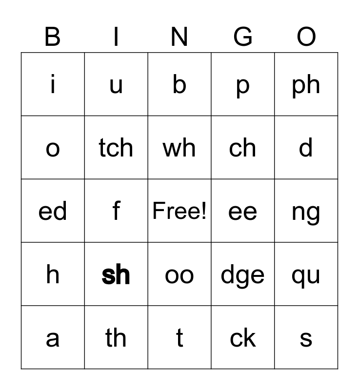 This bingo card has a free space and 24 words: sh, th, wh, a, ph, i, o, u, ee, oo, ch, ed, dge, qu, tch, ck, ng, b, d, f, s, h, p and t.