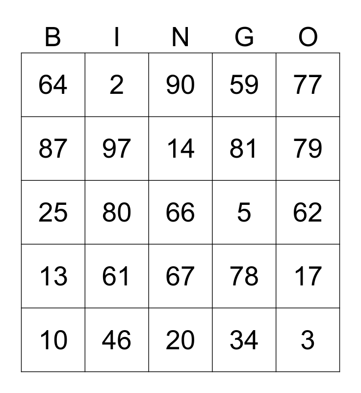 This bingo card has a free space and 24 words: 61, 46, 14, 10, 77, 64, 87, 2, 5, 67, 81, 25, 78, 17, 97, 34, 62, 90, 79, 80, 3, 13, 59 and 20.