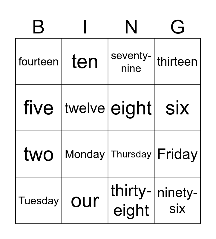 This bingo card has 16 words: our, Friday, seventy-nine, fourteen, two, ten, Thursday, thirty-eight, five, twelve, Tuesday, thirteen, Monday, six, eight and ninety-six.