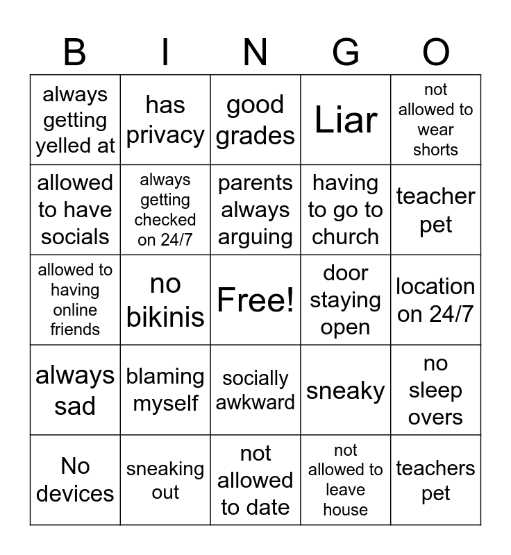 This bingo card has a free space and 24 words: blaming myself, sneaking out, parents always arguing, No devices, not allowed to wear shorts, always getting yelled at, allowed to have socials, has privacy, door staying open, socially awkward, having to go to church, allowed to having online friends, sneaky, no sleep overs, always getting checked on 24/7, not allowed to leave house, location on 24/7, good grades, teacher pet, no bikinis, teachers pet, always sad, Liar and not allowed to date.