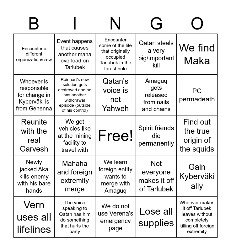 This bingo card has a free space and 24 words: Mahaha and foreign extremity merge, The voice speaking to Qatan has him do something that hurts the party, Qatan's voice is not Yahweh, Vern uses all lifelines, We find Maka, Encounter a different organization/crew, Whoever is responsible for change in Kyberväki is from Gehenna, Event happens that causes another mana overload on Tarlubek, Spirit friends die permanently, We learn foreign entity wants to merge with Amaguq, Amaguq gets released from nails and chains, Reunite with the real Garvesh, Not everyone makes it off of Tarlubek, Gain Kyberväki ally, Reinhart's new solution gets destroyed and he has another withdrawal episode (outside of his control), Lose all supplies, Find out the true origin of the squids, Encounter some of the life that originally occupied Tarlubek in the forest hole, PC permadeath, We get vehicles like at the mining facility to travel with, Whoever makes it off Tarlubek leaves without completely killing off foreign extremity, Newly jacked Aka kills enemy with his bare hands, Qatan steals a very big/important kill and We do not use Verena's emergency page.