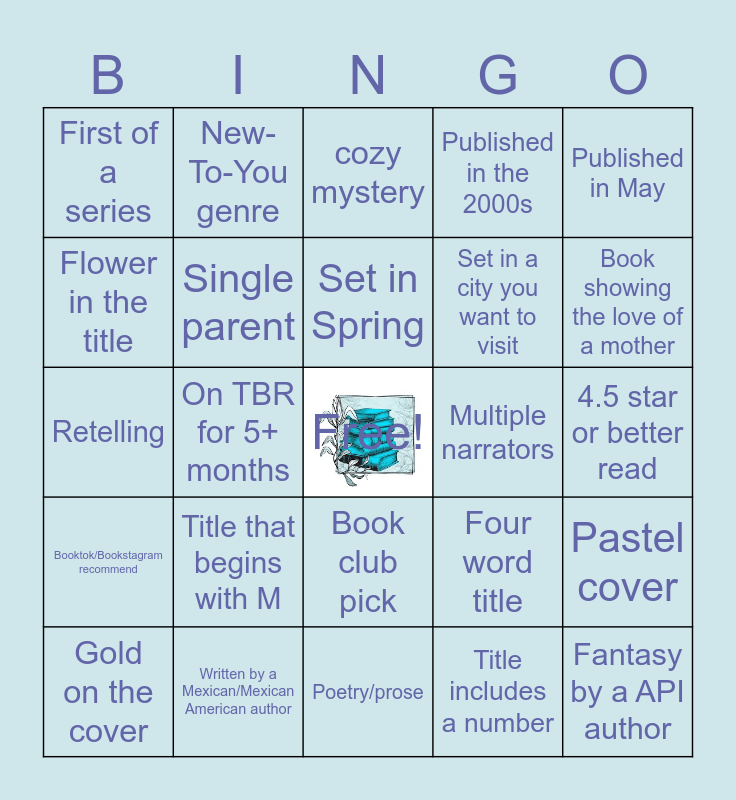 This bingo card has a free space and 24 words: Title that begins with M, Written by a Mexican/Mexican American author, Set in Spring, Gold on the cover, Published in May, First of a series, Flower in the title, New-To-You genre, Multiple narrators, Book club pick, Set in a city you want to visit, Retelling, Four word title, Pastel cover, Single parent, Title includes a number, 4.5 star or better read, cozy mystery, Book showing the love of a mother, On TBR for 5+ months, Fantasy by a API author, Booktok/Bookstagram recommend, Published in the 2000s and Poetry/prose.